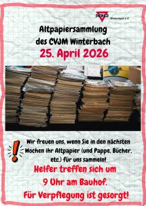 - Altpapiersammlung am 25. April 2026Die nächste Altpapiersammlung des CVJM Winterbach findet am 25. April 2026 statt. Wir freuen uns, wenn Sie in den nächsten Wochen das Altpapier sammeln, statt in die blaue Tonne zu… Altpapiersammlung am 25. April 2026 weiterlesen