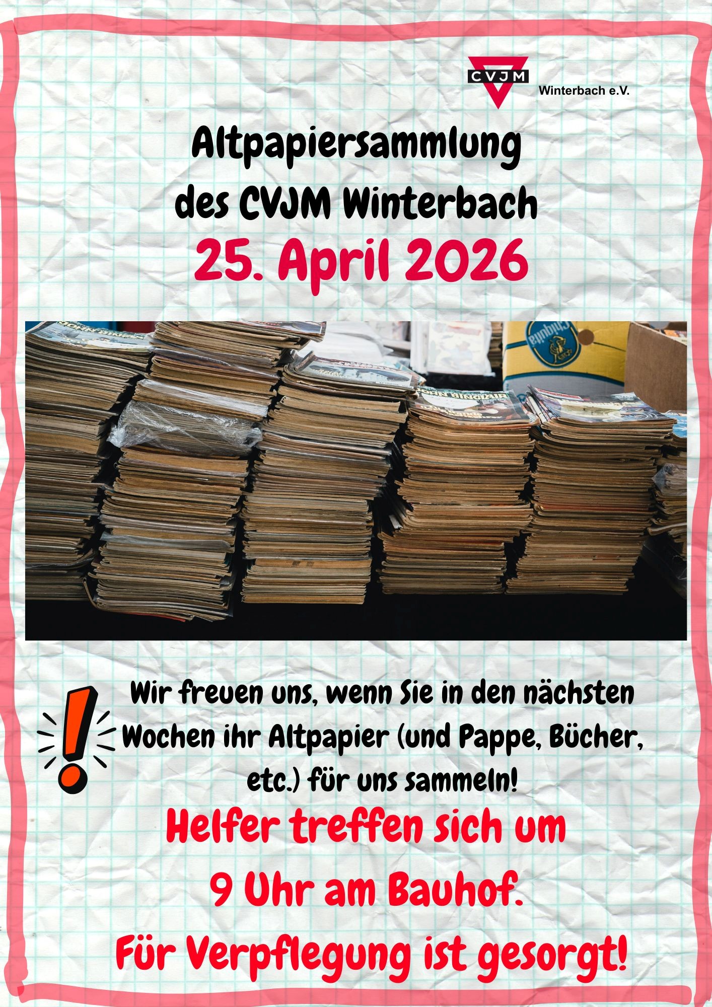 Die nächste Altpapiersammlung des CVJM Winterbach findet am 25. April 2026 statt. Wir freuen uns, wenn Sie in den nächsten Wochen das Altpapier sammeln, statt in die blaue Tonne zu werfen.